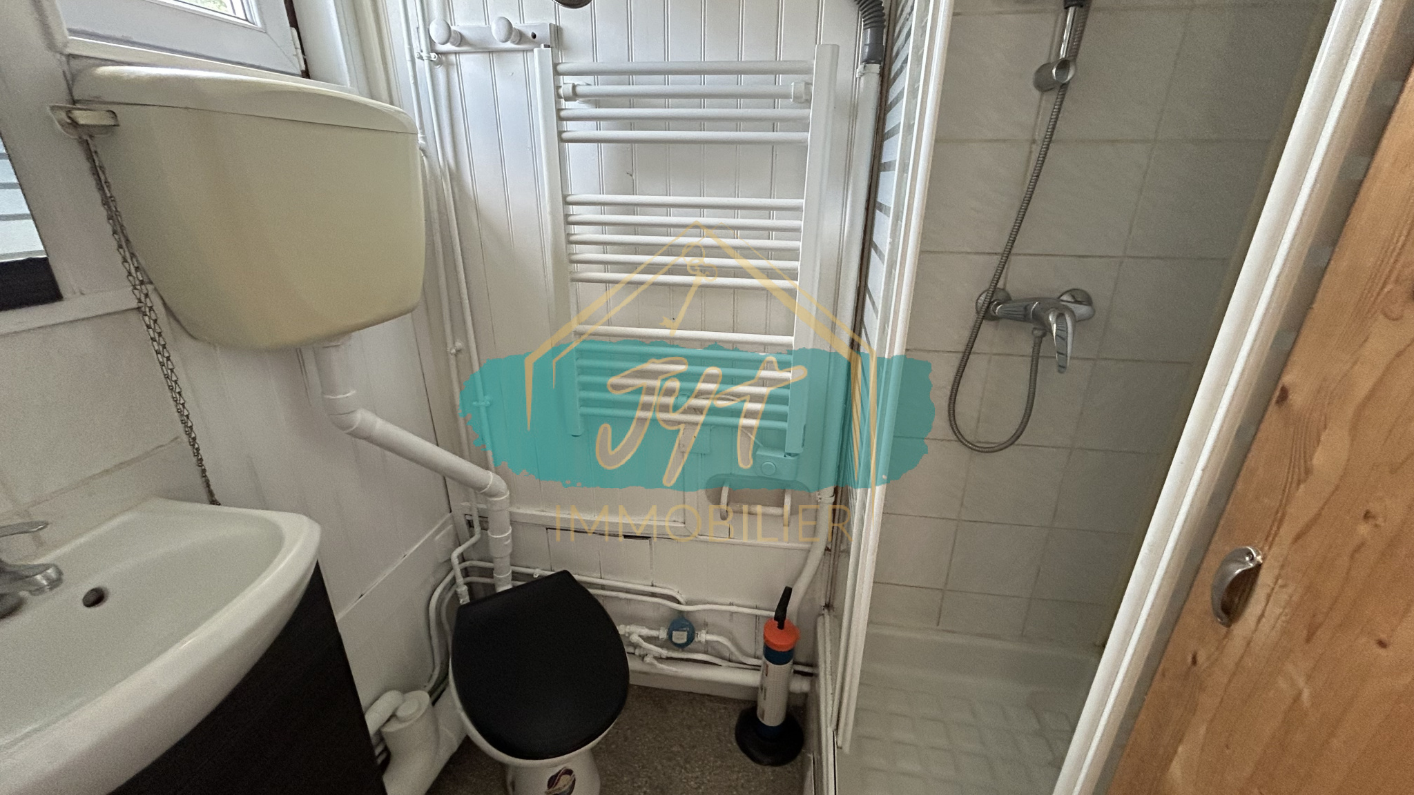 Pièce principale avec coin cuisine, salle d'eau ainsi que WC indépendant.