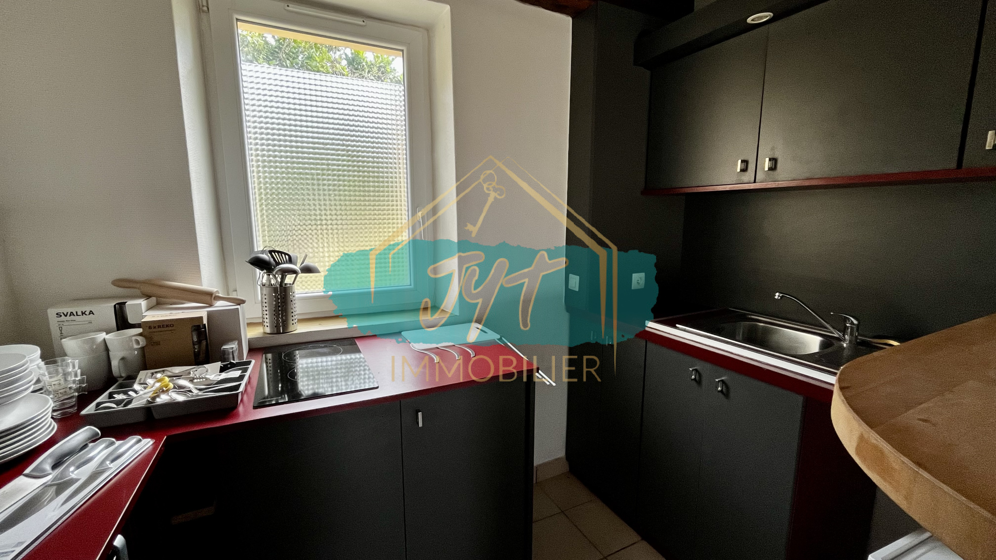Beau studio meublé AU CALME offrant entrée sur pièce principale, cuisine aménagée ouverte, salle d'eau/WC.